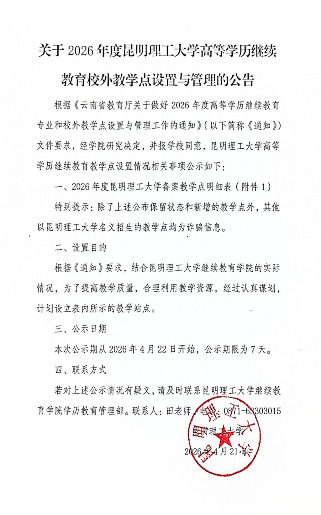 关于2026年度昆明理工大学高等学历继续教育校外教学点设置与管理的公告